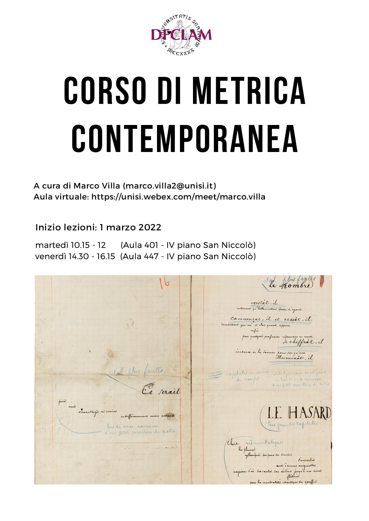 1 marzo 2022: inizio corso di Metrica Italiana del '900 con Marco Villa