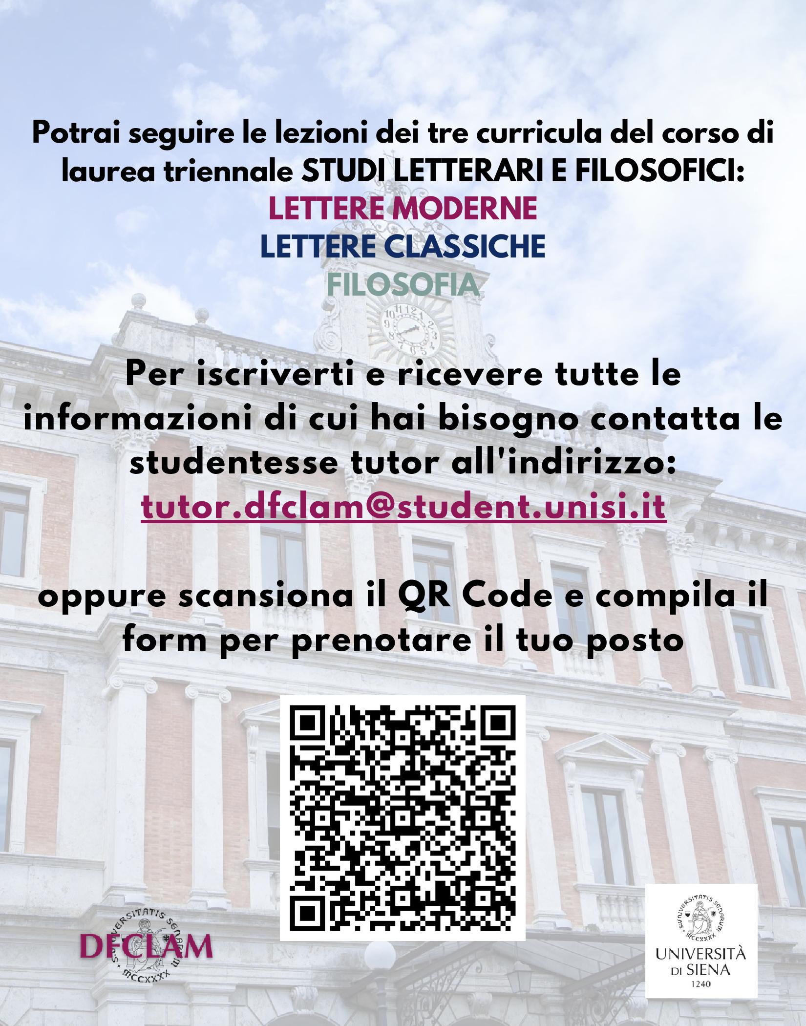 Per l’iscrizione e informazioni contattare gli/le studenti/esse tutor DFCLAM all’indirizzo e-mail tutor.dfclam@student.unisi.it (o alla pagina instagram), oppure compilare direttamente il modulo di iscrizione QUI