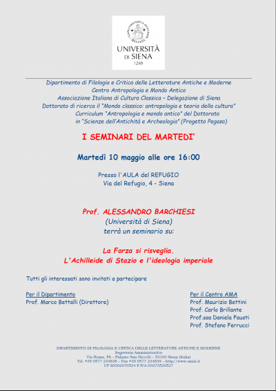 Il seminario si terrà, come di consueto, alle ore 16:00 presso l'Aula del Refugio (Via del Refugio, 4 Siena)