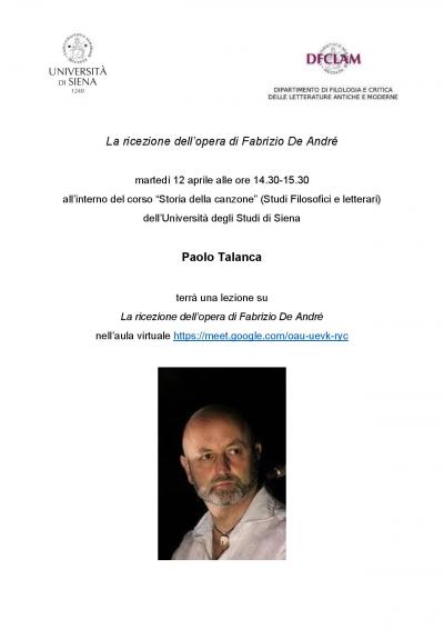 Paolo Talanca terrà una lezione su La ricezione dell’opera di Fabrizio De André all’interno del corso “Storia della canzone” (Studi Filosofici e letterari) dell’Università degli Studi di Siena