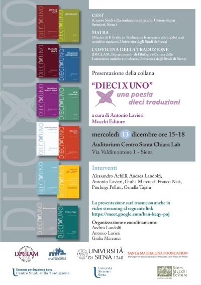 Mercoledì 13 dicembre, ore 15, nell’ambito del Master di II livello “Traduzione letteraria ed editing dei testi antichi e moderni (Matra), si terrà la presentazione della collana “Deci per uno. Una poesia dieci traduzioni”, a cura di Antonio Lavieri - Mucchi Editore