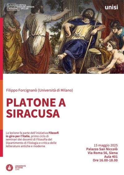 Nel pomeriggio del 15 maggio, presso Palazzo San Niccolò (quarto piano, aula 401) il prof. Filippo Forcignanò, dell’Università degli Studi di Milano, terrà la lezione “Platone a Siracusa”. L’iniziativa fa parte del ciclo di seminari “Filosofi in giro per l’Italia”, organizzato dai docenti di Filosofia del Dipartimento di Filologia e critica delle letterature antiche e moderne.