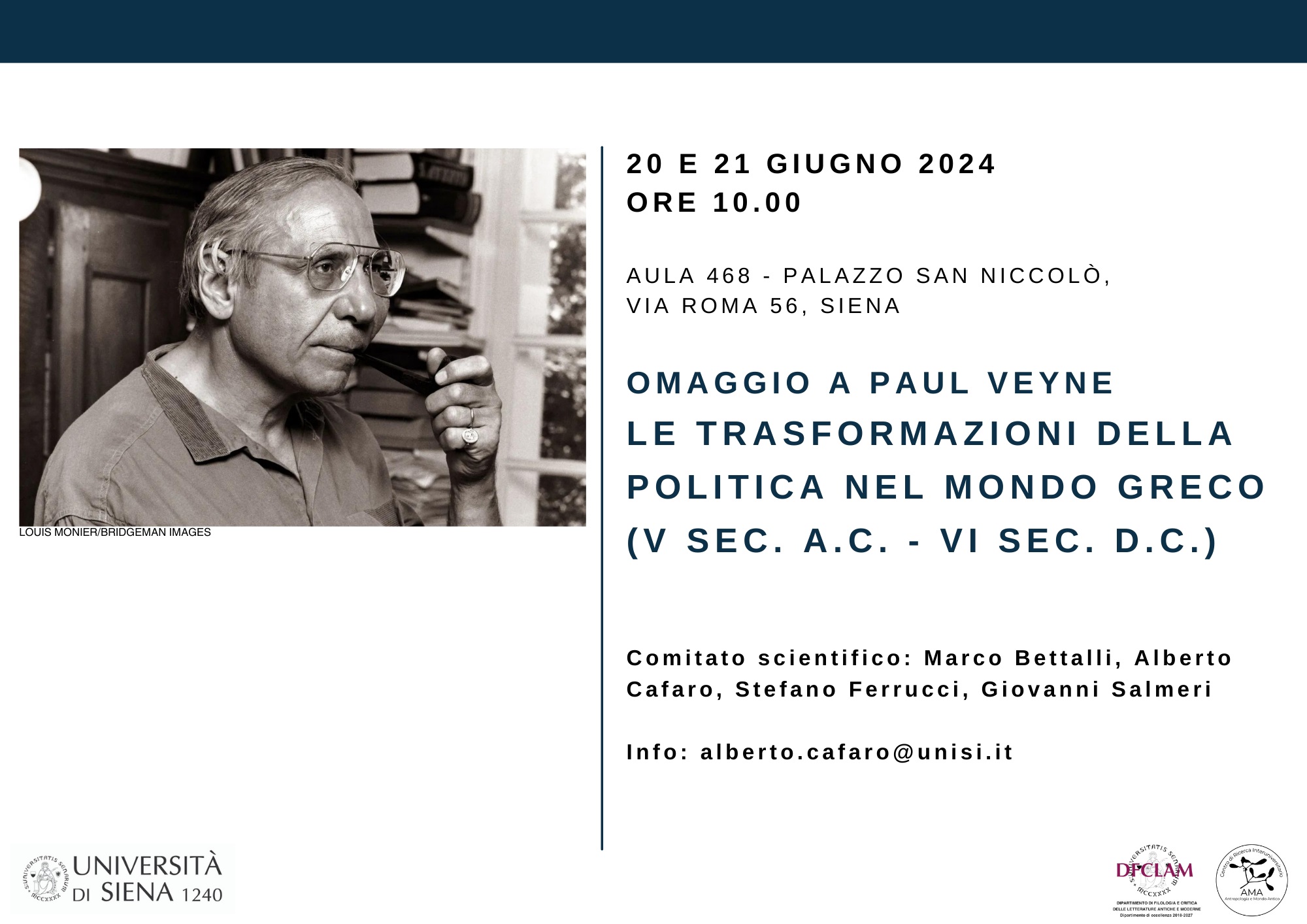 Nei giorni 20 e 21 giugno, nell’aula 468 del complesso didattico San Niccolò (Via Roma, 56 – Siena), si terrà un Convegno di studi per un Omaggio a Paul Veyne dal titolo: