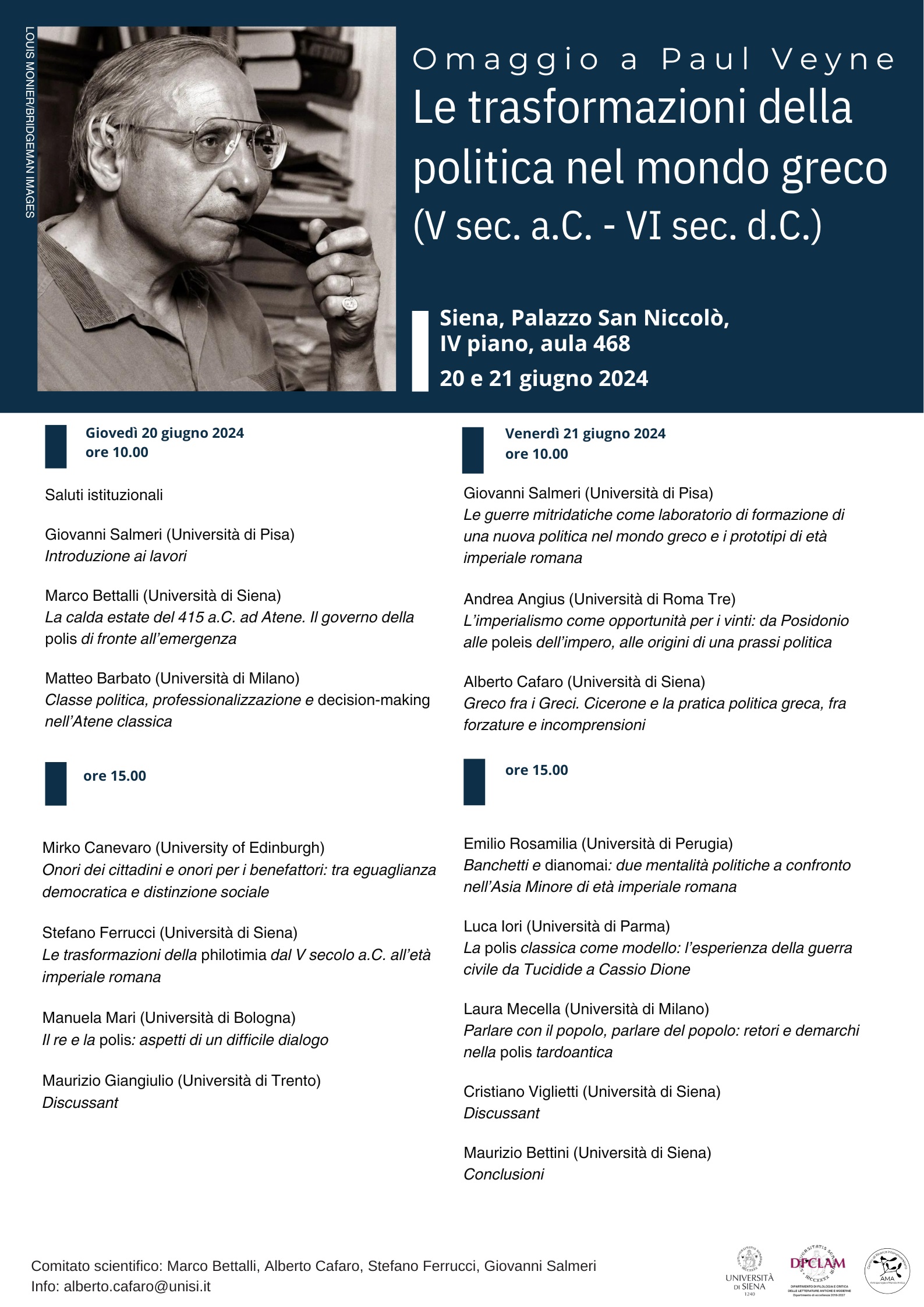 20 - 21 Giugno 2024: Convegno in Omaggio a Paul Veyne: "Le trasformazioni della politica nel mondo greco (V sec. a.C. – VI sec. d.C.)"