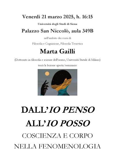 21 Marzo 2025, ore 16.15 - Lezione aperta con Marta Gailli: "Dall'Io penso all'Io posso. Coscienza e corpo nella fenomenologia"
