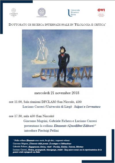 - ore 11.00: Conferenza del Prof. Luciano CURRERI (Università di Liegi) su "Salgari e l'avventura" (Sala riunioni 416 - IV Piano del Palazzo San Niccolò, Via Roma 56 - Siena)