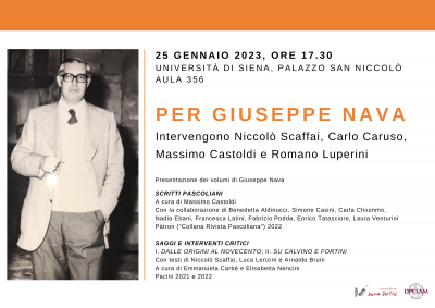 Il 25 gennaio 2023, alle ore 17.30, si terrà all'Università di Siena un incontro dedicato a Giuseppe Nava, con la presentazione dei volumi dei suoi Scritti pascoliani (Pàtron 2022) e Saggi e interventi critici (Pacini 2021 e 2022). Giuseppe Nava è stato professore di Storia della critica letteraria all'Università di Siena, e dal 1995 al 2009 ha diretto il Centro di ricerca Franco Fortini.