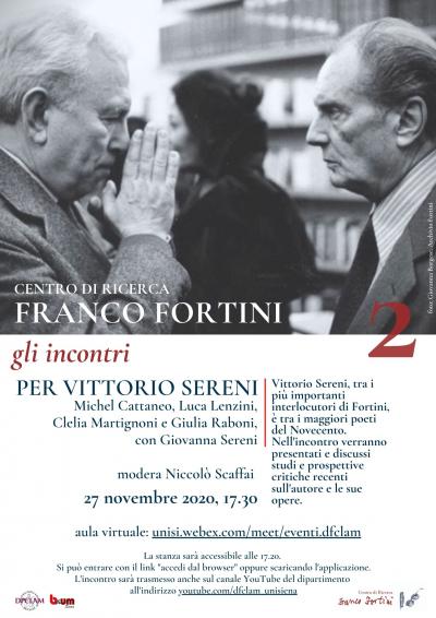 Il 27 novembre, alle ore 17.30, il Centro di ricerca Franco Fortini dedica il suo secondo incontro online uno dei maggiori poeti del Novecento, Vittorio Sereni, che fu tra i importanti interlocutori di Fortini. Nell’incontro verranno presentati e discussi studi e prospettive critiche recenti sull’autore e le sue opere. Interveranno, coordinati da Niccolò Scaffai, Michel Cattaneo, Luca Lenzini, Clelia Martignoni e Giulia Raboni, insieme a Giovanna Sereni.