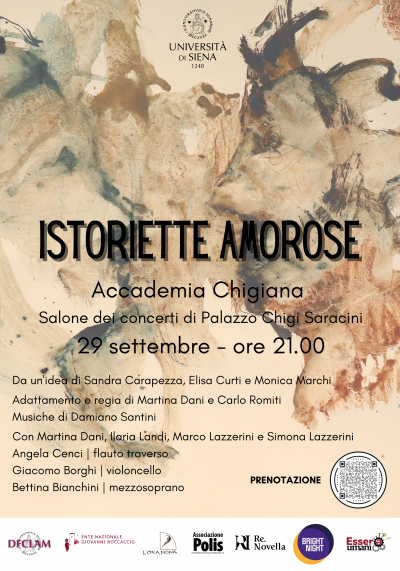 Lo spettacolo Istoriette amorose, nato in collaborazione con Oranona Teatro, nasce come costola di un progetto PRIN-2017 finanziato dal Miur che coinvolge, oltre l’Università degli Studi di Siena anche la Scuola Normale Superiore di Pisa, l’Università Ca’ Foscari di Venezia e l’Università degli Studi di Milano, e ha quale oggetto di ricerca la produzione novellistica del Rinascimento (Re.Novella).