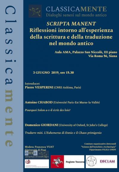 Lunedì 3 e martedì 4 giugno 2019 nuovo appuntamento del Ciclo di seminari "Classicamente. Dialoghi senesi sul mondo antico", promossi dai dottorandi del curriculum in “Antropologia del mondo antico” del dottorato in “Scienze dell’Antichità e Archeologia” in occasione del trentennale del Centro.