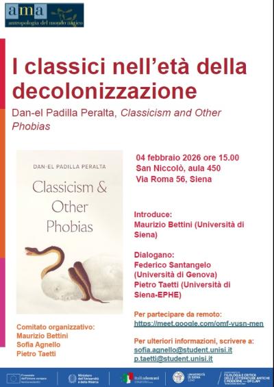 Mercoledì 4 febbraio alle ore 15.00 in aula 450 (IV Piano del Palazzo S. Niccolò, via Roma 56 - Siena), nell'ambito della iniziativa I classici nell'età della decolonizzazione, si terrà un seminario sul volume: Classicism and Other Phobias di Dan-el Padilla Peralta