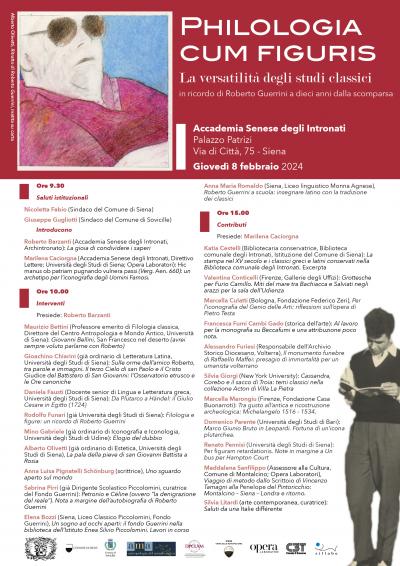 I vari interventi, introdotti da Nicoletta Fabio, sindaco di Siena, da Giuseppe Gugliotti, sindaco di Sovicille, dall’Archintronato Roberto Barzanti e da Marilena Caciorgna del Consiglio Direttivo che ha organizzato l’incontro, saranno tenuti da colleghi e allievi di Guerrini al fine di mostrare, sulla linea del suo magistero, l’eredità culturale dei classici e la loro versatilità nel costante interagire con l’attualità. Lo studioso, uno fra i più insigni che la città abbia avuto negli ultimi decenni, è stato capace di diffondere la cultura senese ai livelli più alti, in Italia e all’estero, lontano dalle retoriche altisonanti, attraverso indagini derivate da un lavoro costante e onesto con esiti di raffinatezza squisita.