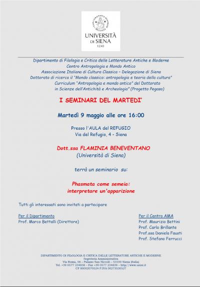 L'iniziativa è organizzata dal Dipartimento di "Filologia e Critica delle Letterature Antiche e Moderne", dal Centro "Antropologia e Mondo Antico", dall'Associazione Italiana di Cultura Classica (Delegazione di Siena) e dal Dottorato in "Scienze dell’Antichità e Archeologia” (Progetto Pegaso) Curriculum “Antropologia e mondo antico”.