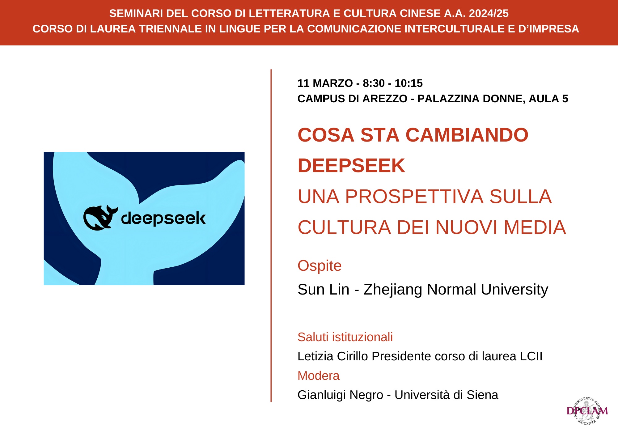 Arezzo, 11 marzo 2025, ore 8.30 - Seminario con Sun Lin (Zhejiang Normal University): "Cosa sta cambiando Deepseek Una prospettiva sulla cultura dei nuovi media"