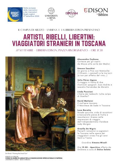 In ambito letterario e culturale, Il giorno 27 settembre, a partire dalle ore 17.30, il Campus del Pionta dell’Università di Siena e la Libreria Edison di Arezzo propongono un evento Bright a cura dei docenti e delle docenti di Letterature straniere del Corso di Laurea in Lingue per la Comunicazione Interculturale e d’Impresa (Dipartimento DFCLAM). Si tratta di un percorso, sul tema del viaggio, dal titolo “Artisti, ribelli, libertini: viaggiatori stranieri in Toscana”, che ripercorre l’itinerario di tanti viaggiatori stranieri che, nei loro libri o nelle loro memorie, raccontano impressioni spesso ricche di dettagli curiosi,