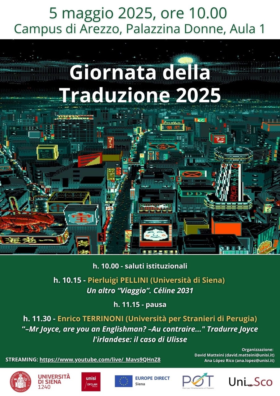 Interverranno Pierluigi Pellini, docente al dipartimento di Filologia e critica delle letterature antiche e moderne dell’Università di Siena, traduttore (L’Assomoir) e curatore dei romanzi di Émile Zola (I Meridiani Mondadori), che terrà una conferenza dal titolo “Un altro ‘Viaggio’. Céline 2031”, e Enrico Terrinoni, docente dell’Università per Stranieri di Perugia, traduttore di James Joyce (Bompiani, Mondadori) e George Orwell (Newton Compton), che terrà una conferenza dal titolo "-Mr Joyce, are you an Englishman? - Au contraire..." Tradurre Joyce l'irlandese: il caso di Ulisse”.