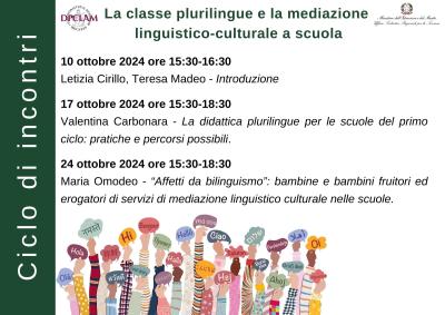 Il corso “La classe plurilingue e la mediazione linguistico-culturale a scuola” si inserisce in questo contesto con la finalità di contribuire a consolidare ed espandere le competenze didattiche, pedagogiche e relazionali degli/lle insegnanti in contesti plurilingui, valorizzandone il profilo professionale e incrementando la qualità dell’offerta formativa.