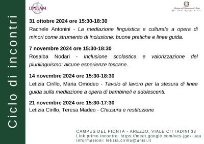 31 ottobre 2024 ore 15:30-18:30. Rachele Antonini (Università di Bologna): La mediazione linguistica e culturale a opera di minori come strumento di inclusione: buone pratiche e linee guida