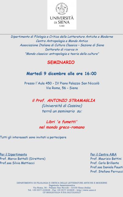 Martedì 9 dicembre alle ore 16:00 presso l'Aula 450 (IV Piano Palazzo San Niccolò, Via Roma, 56 - Siena) il prof. ANTONIO STRAMAGLIA (Università di Cassino) terrà un seminario su: Libri 'a fumetti' nel mondo greco-romano