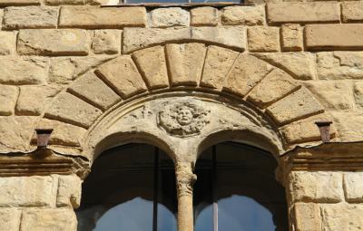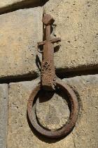 Lungo la fascia piu' bassa della facciata, ad altezza d'uomo, colpisce l'occhio una serie di anelli in ferro sormontati da spade, che ricordano la Spada conficcata nella Roccia da San Galgano.