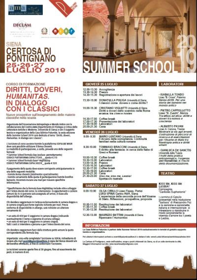 Si è svolta dal 25 al 27 luglio, nella suggestiva cornice della Certosa di Pontignano (Siena), la Sesta edizione della Summer School per insegnanti "Nuove prospettive sull'insegnamento delle materie classiche nella scuola", organizzata dall'Associazione "Antropologia e Mondo Antico" con la collaborazione del Centro AMA (Dipartimento di "Filologia e Critica delle Letterature Antiche e Moderne", Università di Siena) e con il supporto tecnico e organizzativo della Casa Editrice Palumbo.