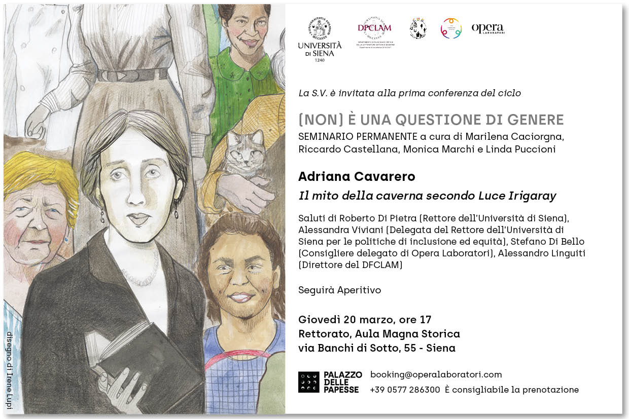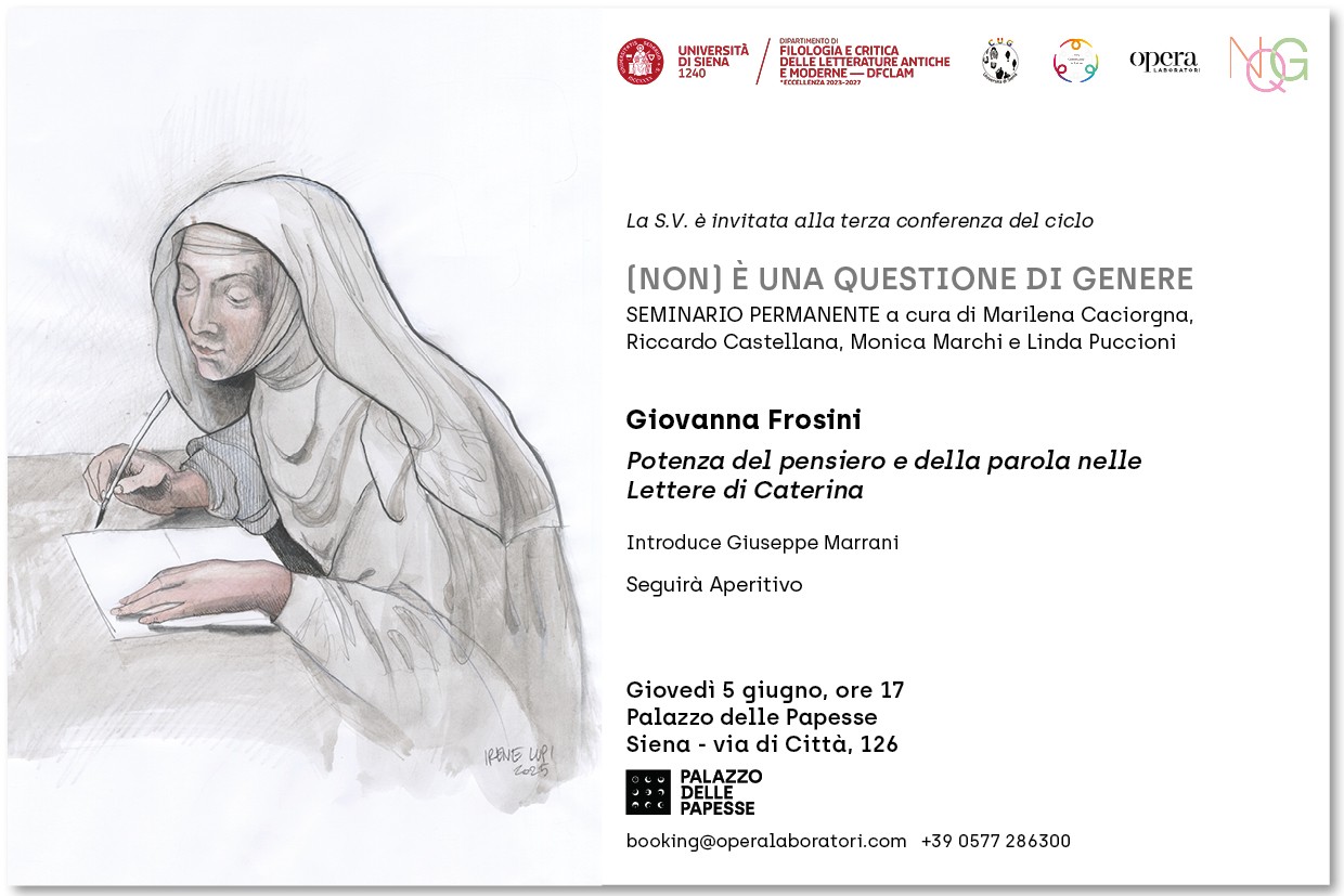 (Non) è una questione di genere è un seminario permanente, a cadenza mensile, organizzato dal Dipartimento di Filologia e critica delle letterature antiche e moderne di Siena in collaborazione con Opera Laboratori, al fine di dare voce a un dibattito, ancora fin troppo silente, attorno alla rappresentazione del femminile, non solo, come suggerisce il titolo, per una questione di genere. Gli incontri, infatti, hanno come obiettivo quello di divulgare il lavoro di ricerca e di creare una rete di dialogo tra Università e città, sia per valorizzare le voci femminili sia per analizzare la visione e il ruolo che la donna ha assunto nel corso dei secoli.